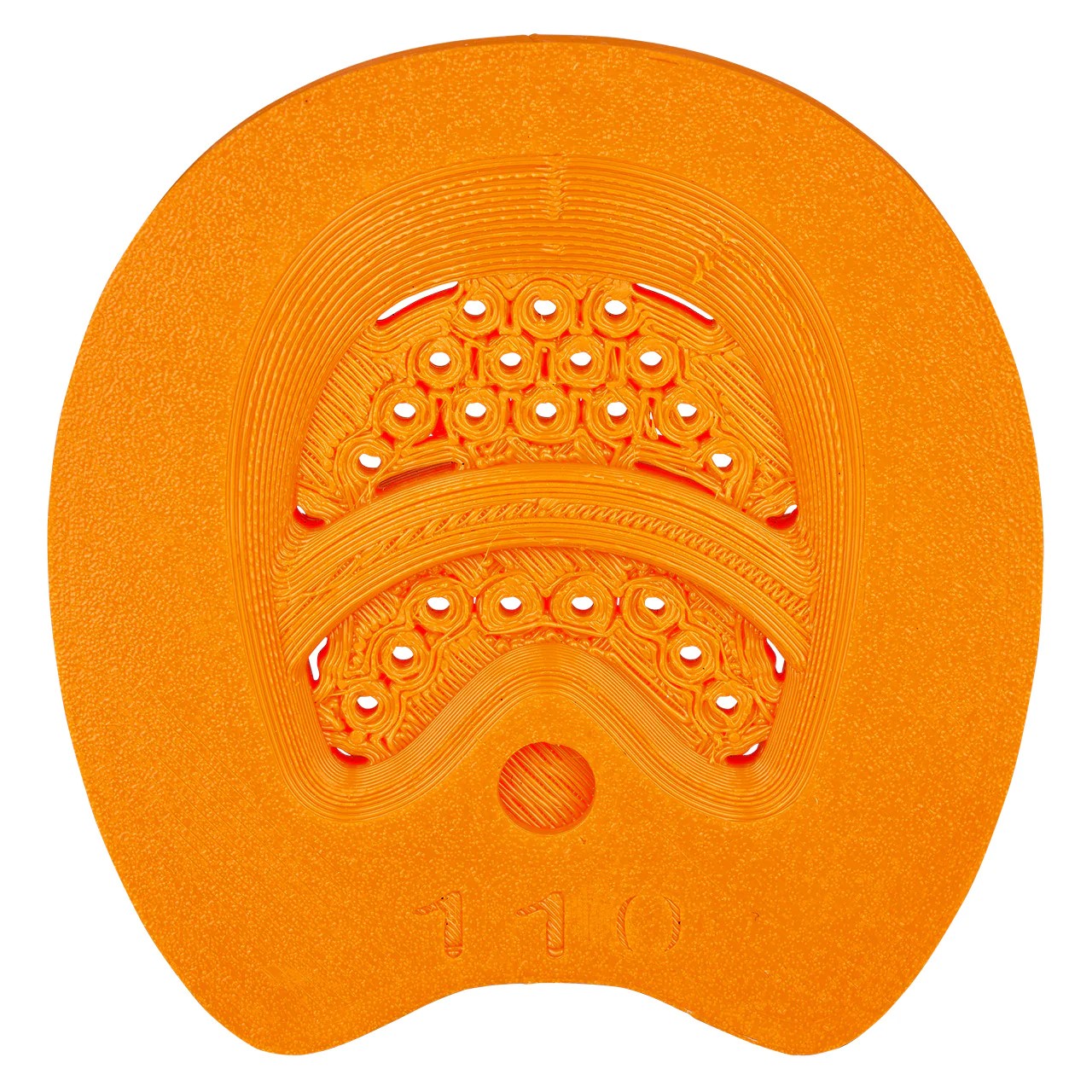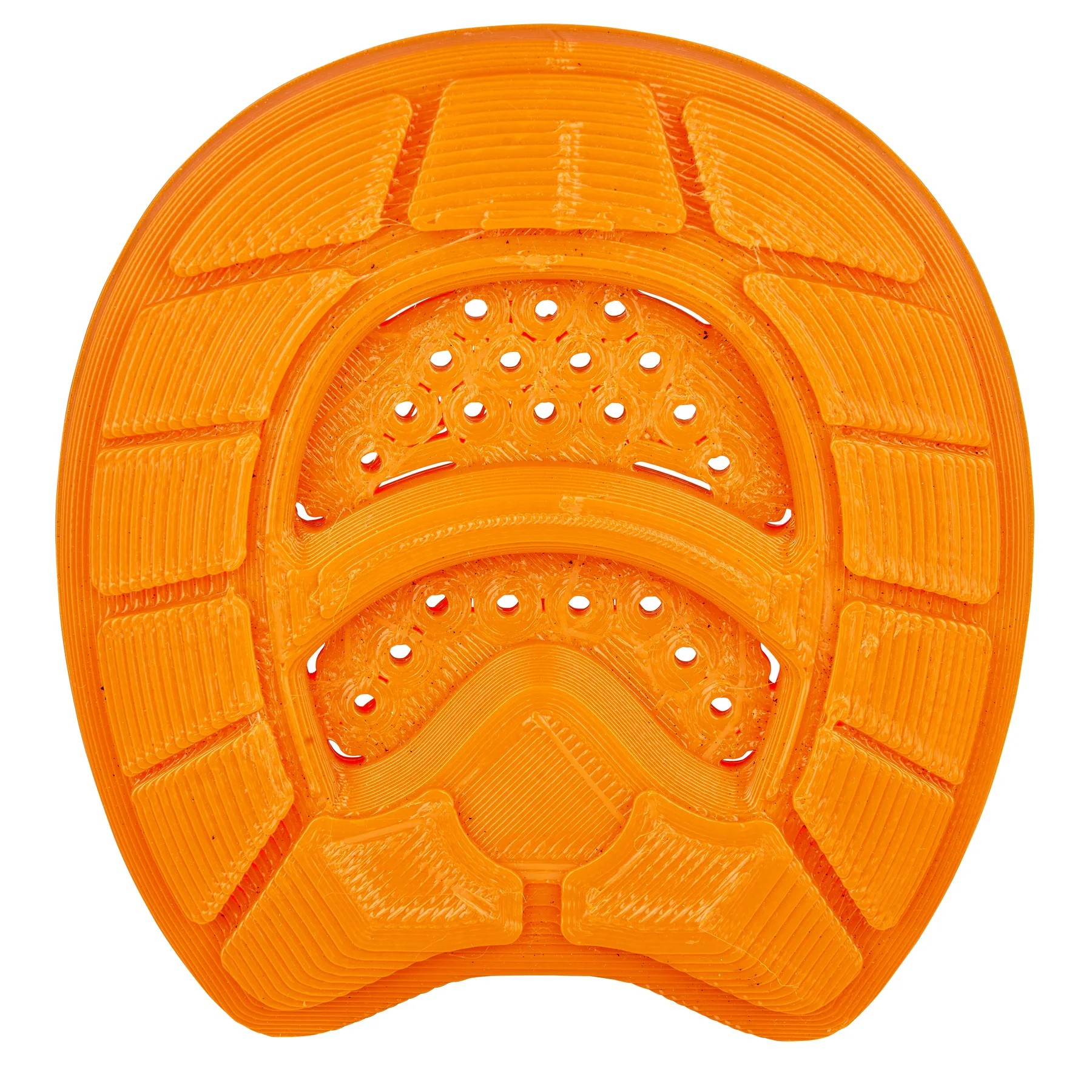 Die Reha Grundplatte ist deutlich steifer, als unsere Normale. Das Sohlengitter ist partiell abgesenkt und mit einem Steg in der Mitte versehen, der ebenfalls leicht abgesenkt, aber höher als die Sohle selbst platziert ist. Das Sohlengitter ist deutlich fester gearbeitet, als bei den normalen Platten, was weiteren Schutz bei z.B. Hufrehe Patienten bietet. Außerdem ist die Unterseite in alle Richtungen abgerundet, was die Wende erleichtert.